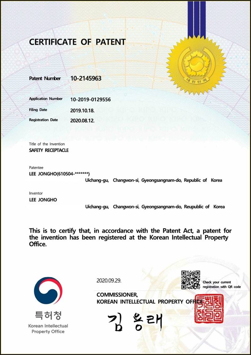 갤러리 카테고리 04) [12-Aug-2020] Korean Patent Registration Registration date 2025-08-29 No. 10-2145963 prev 03) [08-Aug-2020] Winner of the UK CV 2020 Technology Innovator Awards Technology Innovation Award next 05) [January 2022] GOOD LIFE - Safety Outlet-US patent registration List