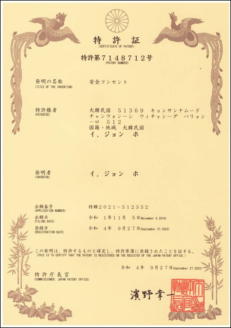 갤러리 카테고리 07) [October 2022] "Safety Outlet" Japanese Patent Registrat… Registration date 2025-08-29 Patent No. 7148712 prev 06) [30-Aug-2022] Korean Patent Registration next 08) [October 2022] Acquired Technical Competency Excellent Certification List