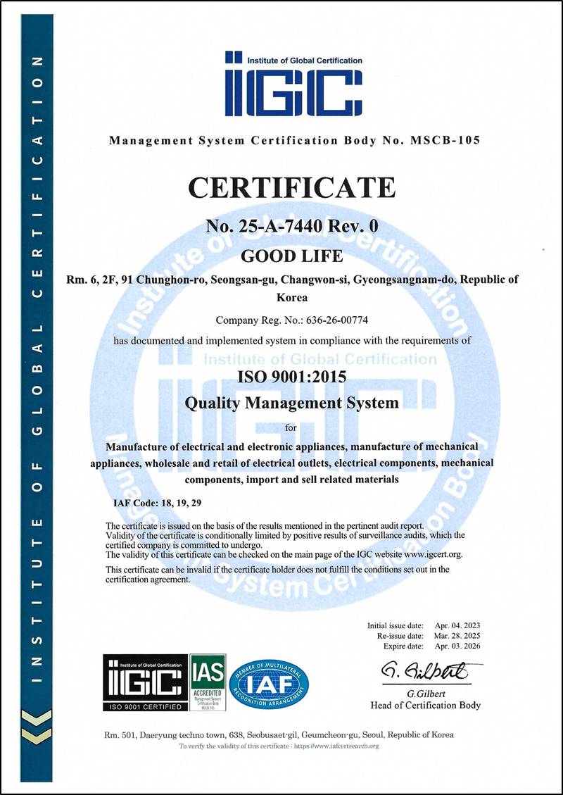 갤러리 카테고리 11) [04-Apr-2023] ISO 9001:2015 Quality Management System Certificatio… Registration date 2025-09-01 Certificate Number: 25-A-7440 Rev.0 (Expiration Date: ~2026-04-03) prev 10) [23-Nov-2022] Korean Patent Registration next 12) [04-Apr-2023] ISO 14001:2015 Environmental Management System Certification List