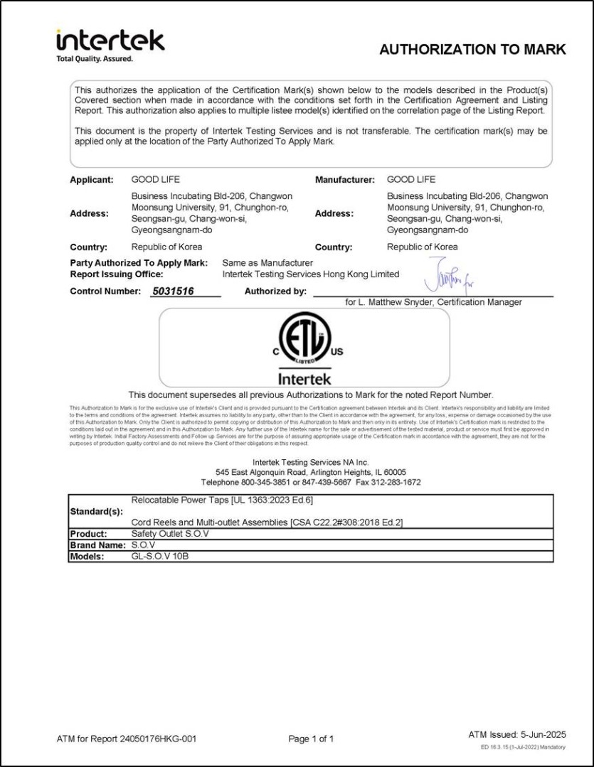 갤러리 카테고리 18) [2025-01-10] ETL Certification Registration date 2025-09-01 Control Number: 5031516 prev 17) [2021-04] GOOD LIFE won the "Gold Award" at Swiss Geneva International Exhibition of Inventions next 19) [October 2025] "Safety Outlet" Japanese Patent Registration List