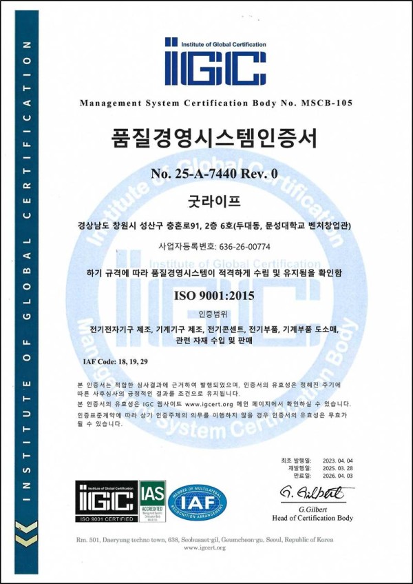 갤러리 카테고리 11) [2023-04-04] ISO 9001:2015 품질경영시스템 인증 등록일 2025-09-01 인증서 번호: 25-A-7440 Rev.0 이전글 10) [2022-11-23] 한국특허 30-1192910 다음글 12) [2023-04-04] ISO 14001:2015 환경경영시스템 인증 목록