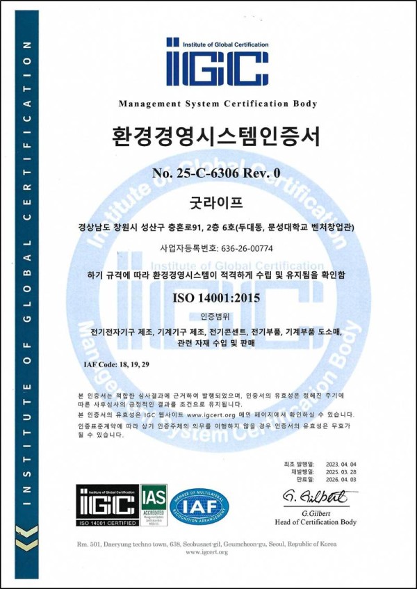 갤러리 카테고리 12) [2023-04-04] ISO 14001:2015 환경경영시스템 인증 등록일 2025-09-01 인증서 번호: 25-C-6360 Rev.0 이전글 11) [2023-04-04] ISO 9001:2015 품질경영시스템 인증 다음글 13) [2023-04-20] 한국특허 10-2525666 목록