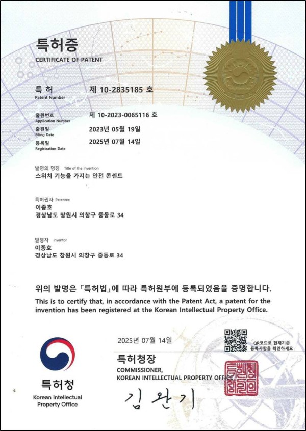 갤러리 카테고리 16) [2025-07-14] 한국특허 10-2835185 등록일 2025-09-01 스위치 기능을 가지는 안전 콘센트 이전글 15) [2025-05-27] 베트남 PAA19-0073-VN0 다음글 17) [2021-04] 2021년 스위스제네바 국제발명품전시회 금상 수상 목록