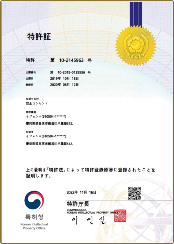 갤러리 카테고리 04) [2020年8月] 韓国特許登録 登録日 2025-09-01 登録番号 : 10-2145963 以前の文 03) [2020年8月] イギリス CV 2020 技術革新大賞受賞 次の文 05) [2022年1月] アメリカ特許登録 目録